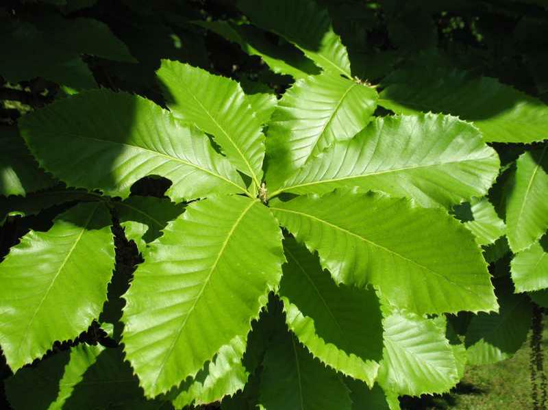 Ovate to broad elliptic, alternate, medium green leaves (to 10” long) have acute apices, attenuate bases, showy yellow midribs and leaf stalks, prominent parallel veins and dentate teeth. Each leaf vein (up to 17 pairs per leaf) ends in a small pointed tooth at the leaf margin. Leaves turn yellow in fall. Monoecious flowers (females in small insignificant clusters and males in somewhat showy olive-yellow catkins dangling to 8” long) bloom in late April-May. Flowers are followed by acorns (to 1 3/4” long) which most often appear at the shoot tips in clusters of 2-5 and ripen in September-October. Each acorn is enclosed in a scaly cup enclosing about 1/2 of the acorn. Shallowly fissured gray to brown bark.