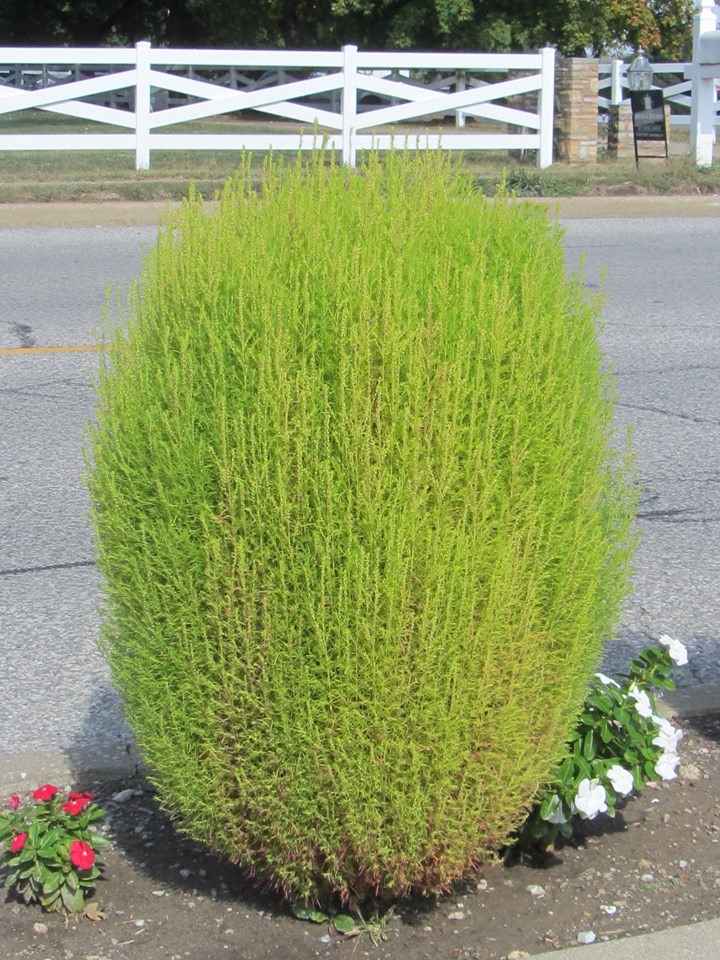 Bassia scoparia f. trichophylla, commonly called burning bush, is an upright, shrubby, warm weather annual that is primarily grown for its attractive shape, light green foliage and bright scarlet red fall color. It typically grows in a single season to 2-3’ (less frequently to 5’) tall with a globular to columnar habit. Branches are clad with feathery, narrow, light green leaves (2-3” long) that turn scarlet red in fall. Flowers are inconspicuous. Plants have a cypress-like form and soft foliage, hence the sometimes used common name of summer cypress. This plant is native to temperate Asia, but has escaped gardens and naturalized in parts of North America. Synonymous with and formerly known as Kochia scoparia f. trachophylla and Kochia trichophylla.