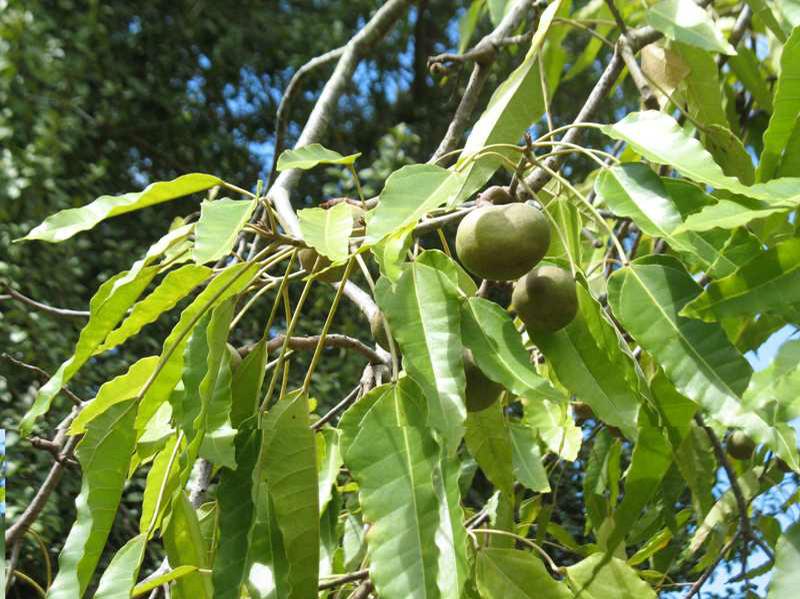 Aleurites moluccanus, commonly known as Kukui or candlenut tree, is a tropical broadleaf evergreen tree in the spurge family that is noted for producing attractive flowers, walnut-sized fruits and maple-like, pale green, evergreen leaves. It typically grows to 20-50’ tall, but less frequently to as much as 90’ tall. It is native from Indonesia and Malaysia into the western parts of Polynesia (exact native range is unclear), but very early spread and naturalized throughout Southeast Asia and the islands in the South Pacific. Polynesian settlers reportedly brought this tree to Hawaii where it has naturalized in open forests, lower alpine slopes, river margins, hillsides and ridges. Although not native to Hawaii, Kukui was designated the Hawaiian State tree in 1959. The flower has been designated as the island flower of Molokai. Historically, Hawaiians once strung candlenuts on a palm leaf tendril and burned them one at a time for light. They also extracted oil from the nuts for use as a fuel in stone oil lamps called Kukui hele po. Kukui means light, hence its use as a common name.