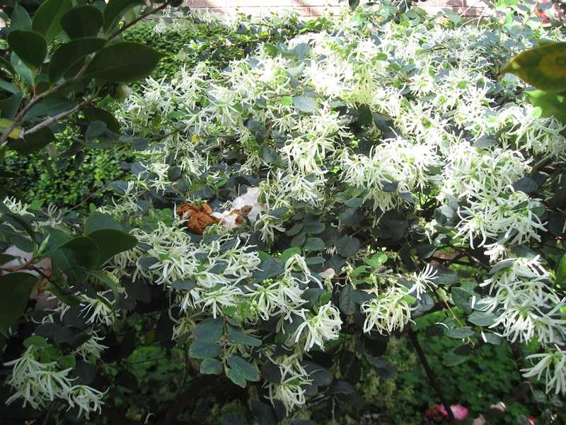 Loropetalum chinense, commonly called Chinese fringe flower, is a white-flowered broad-leaved evergreen shrub of the witch hazel family. It is native to woodlands in China, Southeast Asia and Japan. It typically grows in a rounded multi-stemmed form to 6-10’ tall, but may over time rise to as much as 20’ tall. Alternate, ovate, dark green, evergreen leaves (to 5” long) have asymmetrical bases. Leaves are pale green and pubescent below. Brown shoots are pubescent. Lightly aromatic, spidery flowers bloom in clusters in spring (late March-April). Each flower has four narrow, downward-drooping, strap-shaped white petals (3/4″ wide and 1/16″ long).