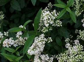 Ligustrum vulgare, called common privet, European privet or wild privet, is a fast-growing, deciduous (semi-evergreen in mild winter climates) shrub that typically grows 10-15’ tall and as wide. It has good winter hardiness and formerly was the most popular species of privet grown for hedging in northern areas. Unfortunately, it is one of the least ornamental of the privets, and is now planted less frequently. Over time, it has escaped landscape plantings and naturalized in many parts of the U.S. and southern Canada. It features oval to lanceolate, dark green leaves (to 5” long) and small, tubular, white flowers in panicles (to 3” long). Flowers bloom at the stem tips in June. Flowers are very fragrant, but are considered by many to have a strong, unpleasant aroma. Flowers give way to globe-shaped, glossy drupes which ripen to black in fall and persist throughout winter. Fruit clusters are considered by some to be the best ornamental feature of this species.