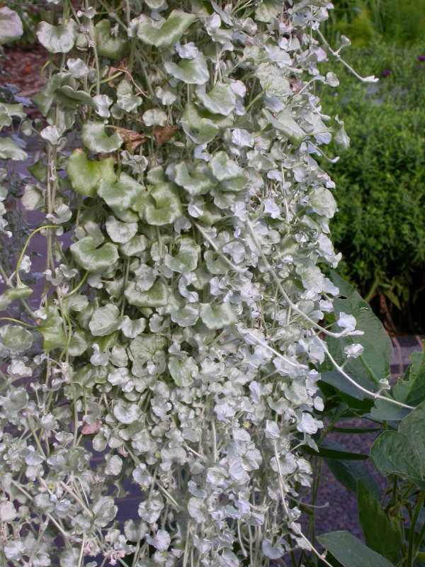 ‘Silver Falls’ is a cultivar that is grown in St. Louis as an ornamental annual foliage plant. It is best grown in baskets/containers or as a seasonal ground cover. From a hanging basket, it will cascade downwards to 3-6’ long in one season. As a ground cover, plants only rise to 2-4” tall, but spread rapidly by stems rooting at the nodes to 3-4’ wide in one season. Branching silver stems are clad with soft, rounded, fan-shaped, silver leaves (to 1” across). Foliage is often described as having a metallic appearance. Tiny greenish-yellow to white spring flowers are not showy.