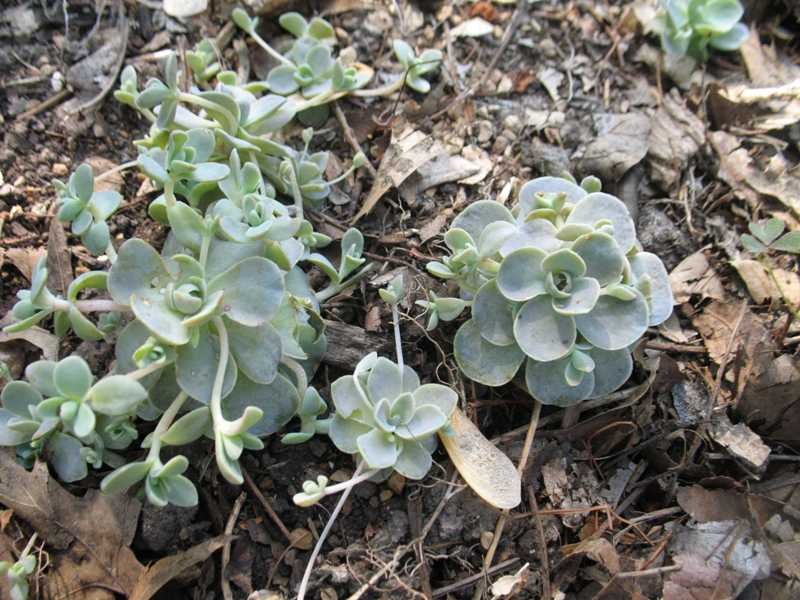 Orostachys boehmeri, commonly known as duncecap, is a succulent from the stonecrop family that is native to Japan. It typically forms a sempervivum-like basal rosette of thick fleshy oblong lavender gray leaves (to 1″ long by 1/2″ wide). Each basal rosette typically matures to 4″ tall but spreads outward to 12″ wide by offset plantlets which radiate from the leaf axils of the main rosette by thin, stolon-like branchlets. Tiny yellow flowers appear in spikes rising from the rosette to 6″ tall. A rosette usually flowers in the second or third year. Each spike is cone-shaped and resembles a dunce’s cap, hence the common name. The flowering rosette dies after producing flowers but the younger offsets that have yet to produce flowers remain. Rosettes that have not bloomed wither in fall, but grow back in spring. Fruits are small follicles which are ornamentally insignificant.