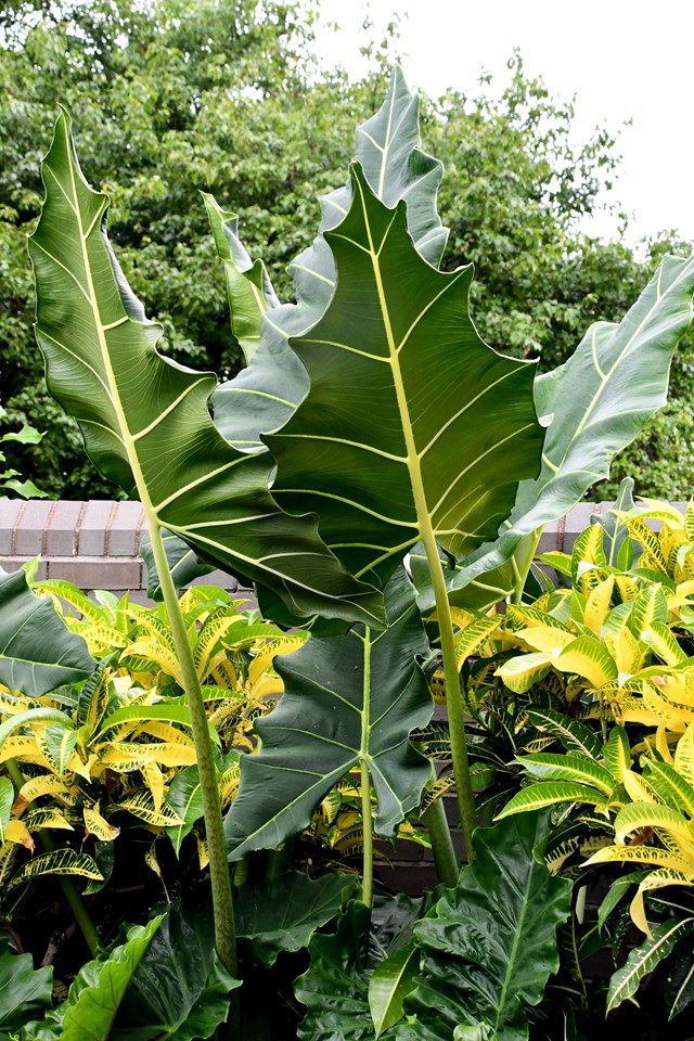 Alocasia is a genus of around 80 species of tuberous, herbaceous perennials native to the tropics and subtropics of Asia and Australia. Closely related to Colocasia (taro). Plants are cultivated as ornamentals and are prized for their showy foliage. The leaves are heart to arrowhead-shaped (12-36″ long), each held singly atop long and sturdy succulent stems. The inflorescences are of the typical aroid type with a spike-like spadix surrounded by a leaf-like spathe. Can produce growth to 6′ tall or more in a single growing season. Leaves often have distinctive veining, markings and/or coloration.