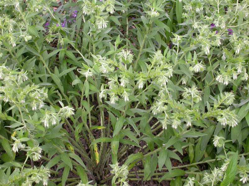 Onosmodium molle is commonly called false gromwell because of a perceived similarity in appearance to some of the gromwells (Lithospermum). This species is a coarse, hairy, somewhat weedy, woody-based perennial that is native from New York to Louisiana and New Mexico north to Saskachewan. It is typically found growing in rocky prairies, glades, thickets and open rocky woods/fields. It grows in an upright shrubby clump to 2-3’ tall, and is noted for its terminal, drooping, bracteose flowering spikes and white nutlets that follow the flowers. Tubular flowers appear in late spring to early summer, featuring 5 creamy white to yellowish-green petals and a distinctive style that extends beyond the end of the flowering tube. Hard white nutlets follow the flowers. Nutlets usually persist on the dead foliage throughout the winter. Nutlets give rise to the additional common name of marbleseed for plants in this genus. Sessile, ovate to lance-shaped leaves. Steyermark lists three subspecies of this plant as being indigenous to Missouri: O. molle subsp. occidentale, O. molle subsp. subsetosum and O. molle subsp. hispidissimum.