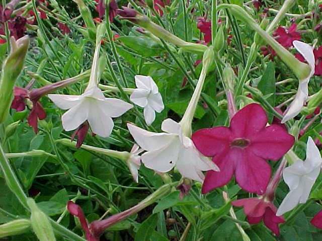 Nicotiana alata, commonly called flowering tobacco or winged tobacco, is native from southern Brazil to northeastern Argentina. It is a somewhat spindly plant that typically grows 3-5’ tall and features nocturnally fragrant, long-tubed, yellowish-green to white flowers that open only at night. Spatulate basal leaves to 12” long are attached by distinctive winged petioles (alata means winged). Upper stem leaves are much smaller and sessile. Species plants are rarely available except from seed, having been replaced by compact cultivars (to 2’ tall) which feature mostly non-fragrant flowers that open during the day in a variety of colors including red, pink, lime-green and white. The common flowering tobacco compact hybrids (N. alata x N. forgetiana) sold in cell/six packs by nurseries are classified as N. x sanderae (e.g., see Domino, Havana, Merlin, Metro and Starship Series). N. tabacum is the species cultivated for smoking tobacco.