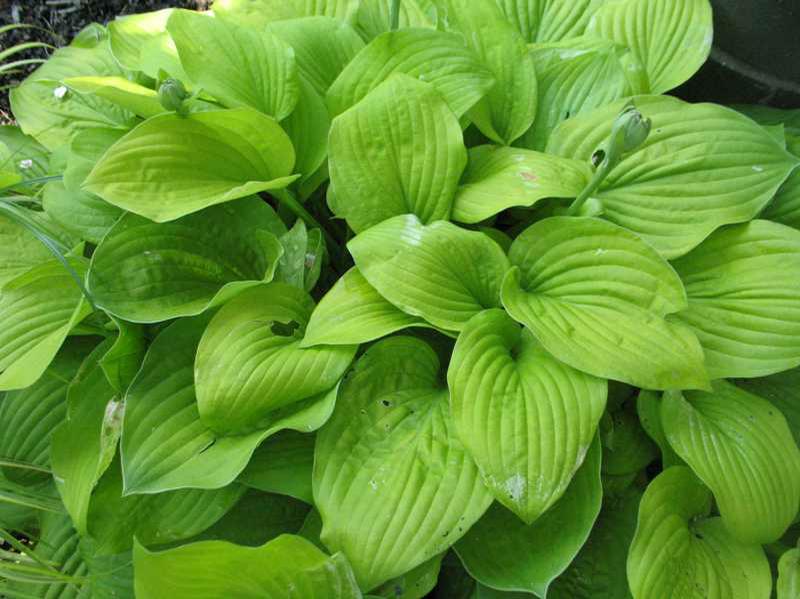 Hosta is a genus of about 70 species of shade-loving, rhizomatous, clump-forming, herbaceous perennials which are native to open woodlands, woodland margins and glades in Japan, Korea, China and eastern Russia. Hostas are primarily grown for their ornamental foliage. Stalked, conspicuously-veined, often dense, basal leaves in a variety of shapes, sizes, colors and textures rise up from a central rhizomatous crown to form a rounded to spreading mound of foliage. Bell or funnel-shaped flowers in terminal, mostly one-sided racemes bloom in late spring or summer atop vertical, unbranched, usually leafless but frequently bracted scapes which rise upward from the crown or rootstock to a point often well above the foliage mound.