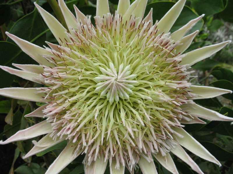 Protea cynaroides, commonly called king protea, is a broadleaf evergreen shrub that is native to South Africa. It typically matures to 3-4′ (less frequently to 6′) tall. It is best known for its huge goblet or bowl-shaped flower heads from 5″ to 12″ in diameter. Each flower head consists of a large, domed, central mass of tepaled inner flowers subtended and surrounded by stiff, pointed, showy bracts ranging in color from red, to pink to creamy white. In its native habitat, flower heads will bloom sporadically throughout the year, but primarily in the warmer months. Somewhat leathery, rounded to elliptic, glossy, dark green leaves grow to 5 1/2″ long.
