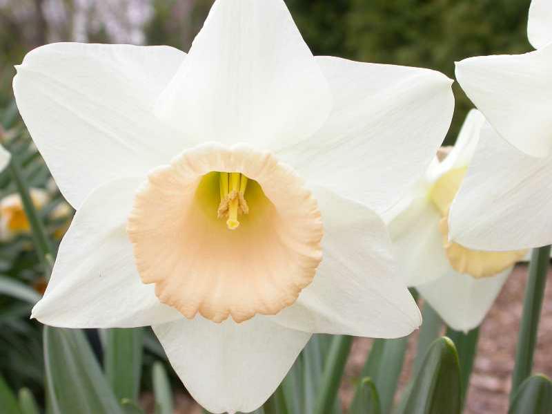 ‘Passionale’ is a large-cupped daffodil (Division II). Large-cupped daffodils are perhaps the most popular of the twelve daffodil divisions. ‘Passionale’ rises 16-18″ tall in early spring. Each flower features white petals and a soft pink cup. One flower per stem. Blooms in late season (April in the St. Louis area). Excellent fresh cut flower.