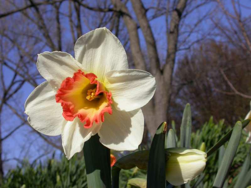 Flower color | White petals and coral-rimmed yellowish-white cup |