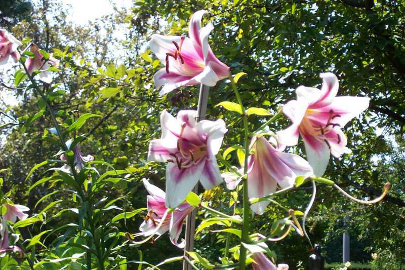 ‘Silk Road’ is an orienpet (oriental × trumpet) hybrid lily (Division VIII). It typically grows on rigid stems to 4-7’ tall. Huge, very fragrant, white flowers (to 8-10” wide) with crimson throats bloom in large inflorescences (to 2’ wide) in mid summer. Good fresh cut flower.