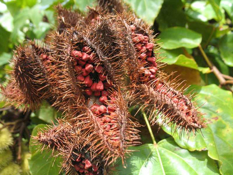 Bixa orellana, commonly called annato or achiote, is an evergreen tropical shrub or small tree that is native to tropical parts of Central and South America. It has been introduced over time to a large number of tropical areas around the world including South East Asia, India and the Philippines. As a shrub, it typically grows to 6-12′ tall, but as a tree will sometimes rise to 20-30′ tall. Pointed, ovate to heart-shaped leaves grow to 3-7″ long. Ornamentally attractive pink flowers (2″ diameter) bloom in terminal branched panicles. Each flower has 5 deciduous sepals and five petals. Flowers are followed by bristly spiny fruit in reddish-brown to bright red capsules. Fruits ripen throughout the year in tropical climates. Each fruit capsule resembles in appearance the bur of a chestnut tree (Castanea). The capsule splits open when ripe to reveal seeds in a layer of orange pulp. Annato is the name of a tasteless orange/yellow dye extracted from the pulp surrounding the seeds. This dye was used many years ago by indigenous people for a variety of purposes including body paint, insect repellant, food colorant, inks, dyes, sunscreen, soap additives and fabric colorant. This plant was also reported to have medicinal uses ranging from treatment for fevers to dysentary to cancers. In the modern world, dyes from this plant are still commercially produced for adding yellow color to a number of food products including chorizo, margarine, rice and cheese. Indigenous people still use the dyes for cosmetics (hence the common name of lipstick tree) and hair dyes.