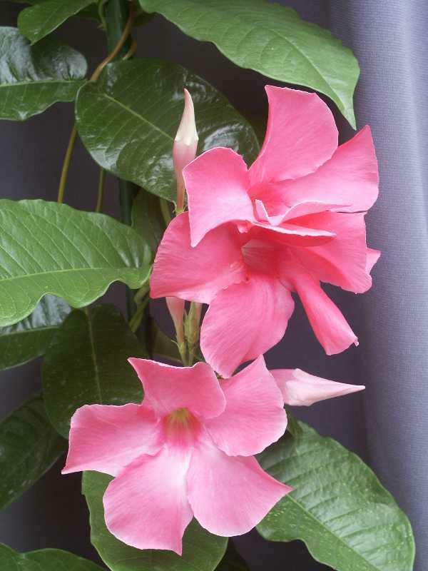 Mandevilla × amabilis is a hybrid mandevilla that produces deep pink flowers. They are woody-stemmed, twining tropical vines that grow to 20’ in Zones 10-11 where they can remain in the ground year-round. When grown in containers, they will grow much shorter, typically producing up to 3-5’ of growth in a season. Features large, funnel-shaped, deep pink flowers that flare into five rounded lobes (to 3-4” across). Flowers have yellow throats. Blooms in summer. Oblong, wrinkled dark green leaves to 3-8” long. Stems exude a milky sap when cut. Synonymous with Dipladenia × amabilis.