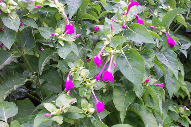 Mirabilis jalapa, commonly called four-o-clock or marvel of Peru, is native to Peru. It is a bushy tender perennial that typically grows to 24-36” (less frequently to 48”) tall on erect, branching stems. It is an old garden favorite that features fragrant, funnel-shaped, tubular flowers (2” long) with five flaring petal-like lobes. Flowers blooms from early/mid-summer to fall. Flowers come in pink, rose, red, magenta, yellow and white, sometimes with interesting mottling and striping. Different colored flowers often appear on the same plant. Flowers open in the late afternoon (around four o’clock) and stay open only until the following morning. Flowers are attractive to hummingbirds. Ovate dark green leaves (to 4” long) are heart-shaped at the base. All parts of this plant are poisonous if ingested.
