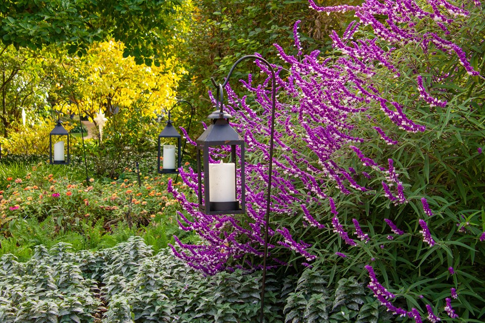 Salvia leucantha, commonly called Mexican bush sage, is an evergreen shrubby perennial that is native to Central America and Mexico. In St. Louis, it is grown as an annual that typically rises 2-3’ tall in a single growing season. This sage is most noted for producing a very attractive late summer to frost bloom of showy bicolor flowers consisting of white corollas and longer-lasting funnel-form purple calyces. Flowers appear in dense, arching, terminal spikes (racemes to 10” long) that extend above the foliage. Flowers are attractive to butterflies and hummingbirds. Linear, lance-shaped, gray-green leaves (to 4” long) are borne in pairs on square stems. Foliage has a velvet-like texture, hence the sometimes used common name of velvet sage for this species.