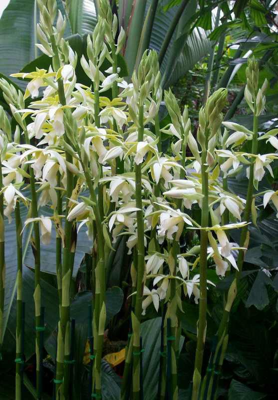 Grow in an organically rich, well-drained, terrestrial orchid culture medium. Keep plants consistently moist, but avoid excess moisture which may lead to root problems including rots. Plants prefer intermediate to warm temperatures in the range of 60–70°F, with bright light to light shade, but not direct sun. Humidity should be 50% or greater. Plants perform best with regular fertilization. Fertilize weekly at half strength after a thorough watering. Water early in the day, but avoid wetting the leaves. Flush the growth medium often to avoid salt buildup. Watering with distilled water prevents the leaf tips from turning brown. Good air circulation helps prevent fungal problems. Tall flower spikes require staking. Repot after flowering, splitting growth into four pseudobulbs per pot. Propagate from flower stalks by cutting each stalk into pieces after bloom, one “eye” per piece, and laying the pieces on damp sphagnum moss to form plantlets.
