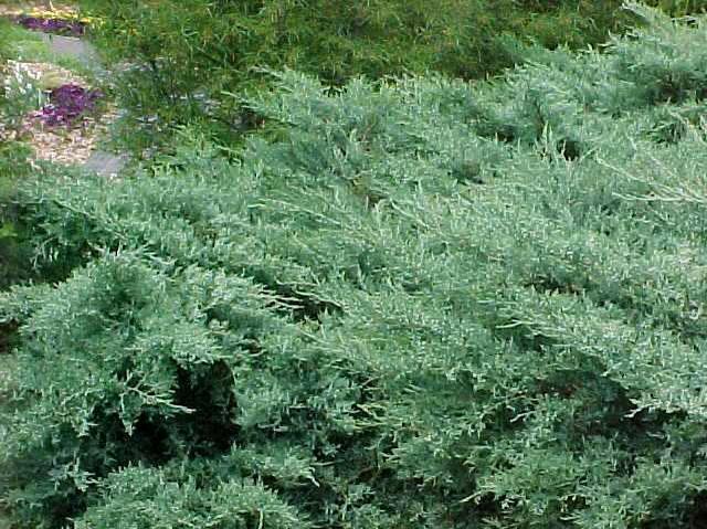 ‘Grey Owl’ is a broad, slow-growing cultivar with a compact, wide-spreading habit which typically grows up to 3′ tall (infrequently larger) and to 6′ wide. Features scale-like, silver gray foliage. A female form which produces profuse, glaucous, berry-like cones which are attractive to birds. This plant may be a hybrid, but it is usually listed for sale as a cultivar of Juniperus virginiana.