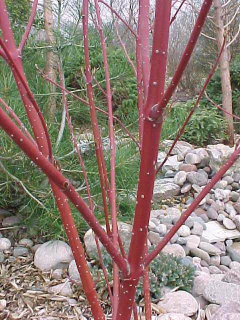 Can be combined with yellowtwig dogwoods (e.g., Cornus sericea ‘Flaviramea’) for an interesting bicolor winter stem display.
