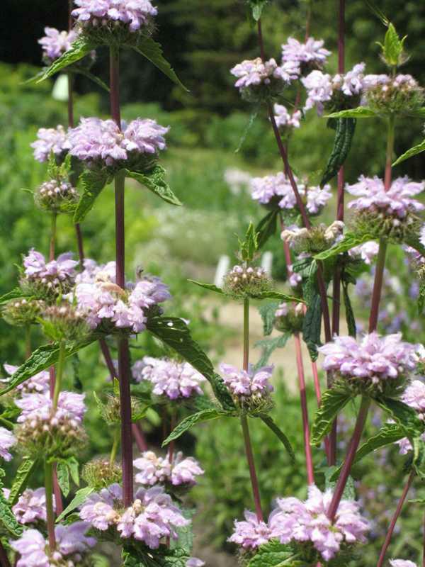 Phlomis tuberosa is a tuberous-rooted perennial of the mint family. It is native to southern Europe and Asia. Tiny, tubular, lavender-pink flowers in dense whorled clusters (verticillasters) bloom at intervals up long, columnar, 4-angled, dark red flowering stems (to 8 clusters per stem) in late spring to early summer (May – July). Flower clusters give way in summer to ornamental seed heads which remain attractive throughout fall into winter. Wrinkled, toothed, arrowhead-shaped, rough-textured, green basal leaves (to 8″ long) form a mound of foliage to 15″ tall, but the upright flower stems rise well above that foliage to 3-4′ tall.