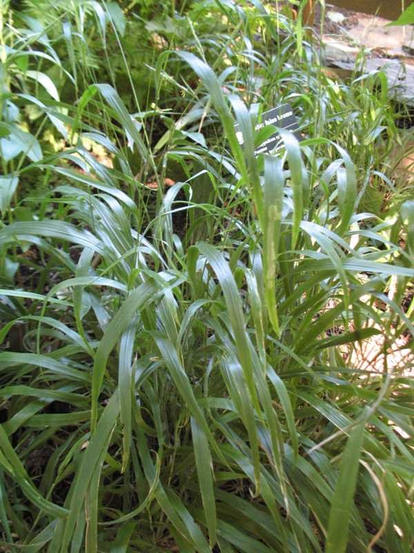 Slender false brome grass features (- branchless hollow culms (flower stalks) rising to 3’ tall, (- dense tufts of arching, hairy, linear-lanceolate, yellow-green to green leaves to 12” long by 1/2” wide, (- culm-topping, noticeably drooping flower spikes, each of which contains 4-12 spikelets (flower clusters) on very short 1/2” pedicels, and (- a lengthy July-October bloom.