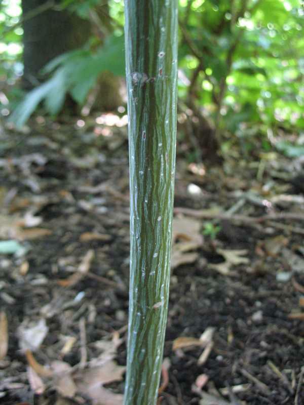 Acer capillipes known as snakebark maple is native to mountainous areas of Japan. It is a small, rounded, deciduous tree with dense, arching branching that grows to as much as 40’ tall. It is also often seen growing in the wild as a large, multi-stemmed, tree-like shrub. As the common name suggests, it is perhaps best noted for its snake-like, olive green bark accented with narrow, white vertical striping. Broad-ovate, glabrous, three-lobed leaves (to 5” long) with large central lobes and serrated edges emerge reddish in spring, but mature to dark green. Young shoots, leaf stalks and veins are reddish in color. Small, greenish white flowers (1/3” diameter) bloom in pendant racemes in spring. Flowers give way to winged samaras (to 3/4” long). Excellent orange to red fall color.