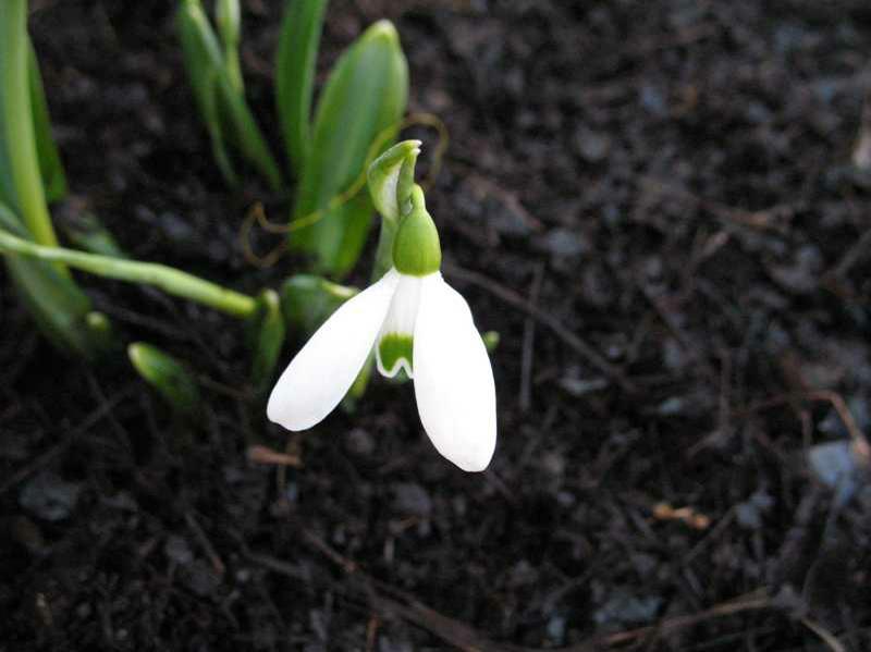 Galanthus elwesii, commonly called giant snowdrop, has larger flowers, leaves and size than the similar common snowdrop (G. nivalis). Snowdrops bloom in February-March in the St. Louis area, often poking their flower heads up through snow cover if present. The common name refers to the supposed resemblance of the flowers to drops of snow. Each bulb produces two-three narrow (to 1 1/4” wide), linear, basal leaves (to 4” long at flowering) and a leafless flower scape (to 6-10” tall) which is topped with a single, nodding, white, waxy, bell-shaped flower (to 2” long). Each flower has green markings at the base and apex. Leaves will elongate after bloom.
