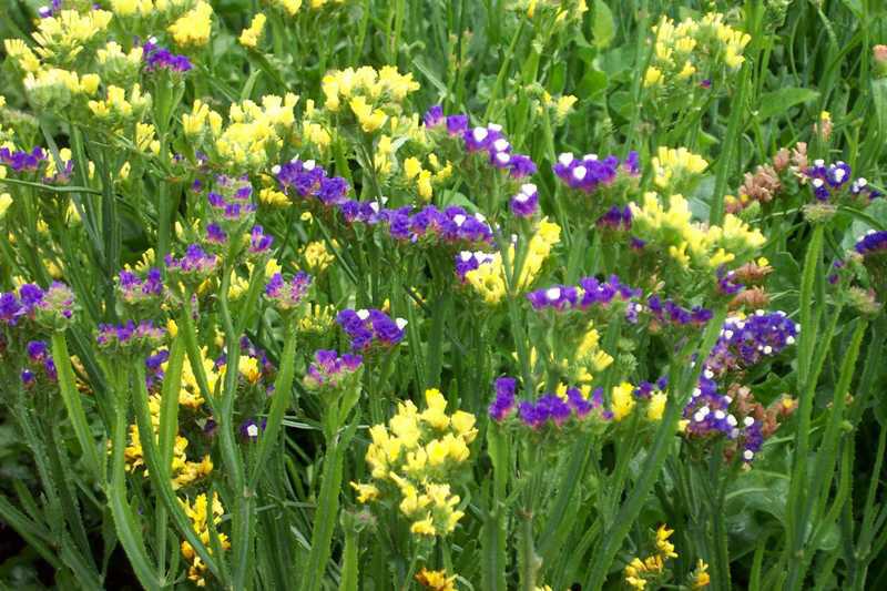 Limonium sinuatum is native to the Mediterranean region. Commonly called statice or notchleaf status, it is noted for producing clusters of papery, funnel-shaped flowers in summer. Flowers appear in panicles of clustered spikelets atop distinctively winged, nearly leafless stems rising to 18” tall from basal rosettes of lyrate-pinnatifid wavy-margined leaves (to 4-6” long). Flower corollas are white and showy calyces are violet-blue (seed strains come in varying shades of violet, lavender, purple, pink, rose, orange, yellow and white). Calyces remain long after the corollas have disappeared. Excellent as a fresh cut flower and for dried arrangements.