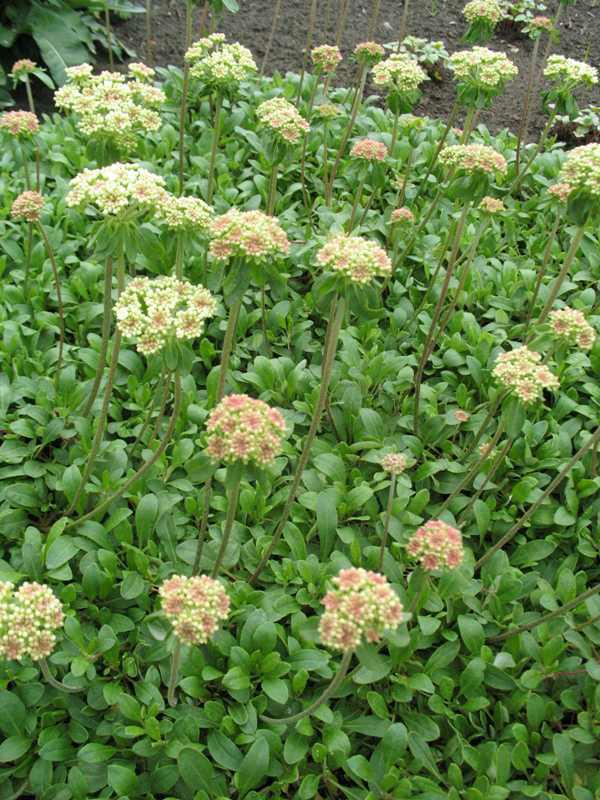 Eriogonum umbellatum, commonly called sulphur flower, is a highly variable wildflower that is native to dry rocky soils in rocky forests, foothills, mountain slopes and mountain ridges from British Columbia and Alberta south to southern California, Arizona and the eastern edge of the Rocky Mountains in Colorado. Flora of North America lists 41 different varieties of this plant. This is a spreading, mat-forming perennial that is noted for its tiny sulphur yellow flowers which bloom from late spring into summer in compound umbels (rounded flower clusters to 4″ wide) located atop leafless flowering stalks rising to 12″ tall. Each umbel is subtended by a whorl of leaf-like bracts. Flowering stalks rise well above low-growing basal mounds of leathery, spatula-shaped, gray-green leaves (each 1/2″ to 5″ long). Leaves appear both in a basal rosette below the primary flowering stalk and as whorls at the ends of short woody stems emanating from the woody plant base. Leaves acquire red tones in fall. Each bell-shaped flower (to 1/4″ long) has 6 petal-like lobes. Flowers emerge sulphur yellow to cream, but age to an orange-yellow. Flowers ultimately age to brown and are attractive in dried arrangements. Plants will spread over time to 1-3′ wide. Flowers are attractive to a large number of butterflies and bees. Birds are attracted to any seed that develops. This plant is also commonly called sulphur buckwheat.