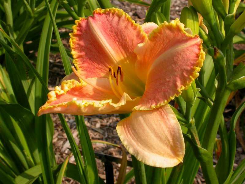 Hemerocallis is a genus of about 15 species of herbaceous perennials commonly known as daylilies. These plants are native to Asia and central Europe. Most plants are fibrous rooted, but some are tuberous rooted. Daylilies sold in commerce today are almost entirely hybrids. Few straight species plants are now found in gardens. Hybridizers have expended considerable effort over the years creating new daylilies featuring flowers with new colors, color combinations, shapes and patterns. More than 60,000 cultivars have now been registered by the American Hemerocallis Society with the numbers continuing to climb. Each flower typically remains open for one (but sometime two) days, hence the common name of daylily. Flowers are produced in succession in such quantity that the plants remain in flower over a long period of time. Flowers are typically funnel-shaped to bell-shaped, often coming in a variety of different forms, including single, double, polypetalous, spider or unusual (includes crispate, cascading and spatulate). Each flower has six spreading, recurved or sometimes nearly erect perianth segments, six stamens and a long slender style ending in a small stigma. Flowers now come in almost every imaginable color except blue, often sporting such features as contrasting eyes or mid-rib stripes or a sprinkling of diamond, ruby or gold dust. Flowers range in size from 3-8” across. Some flowers have ruffled edges. Flowers bloom on naked scapes from spring to late summer. Some cultivars will rebloom. Each plant features basal, linear, grass-like to sword-shaped foliage. Cultivars may grow from 1-6’ tall, but most mature to about 3-4’. Plant foliage usually dies in fall, but is sometimes semi-evergreen or evergreen.