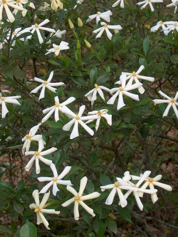 Native to South Africa, Gardenia thunbergii, commonly called white gardenia, is a tropical/semi-tropical evergreen shrub that typically grows to 6-15’ tall (smaller in containers) and features glossy, elliptic to oval, conspicuously veined, green leaves and solitary, extremely fragrant, showy, mid- to late winter flowers. Each flower (to 5” across) is creamy white with a tubular corolla with 8 large spreading petal-like lobes.