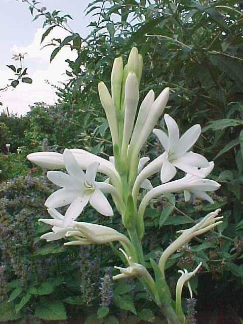 Polianthes tuberosa, commonly called tuberose, is probably native to Mexico although it is not known to exist naturally in the wild today. It is considered to be a cultigen and has a long history of cultivation dating back to pre-Columbian times. Growing from a tuberous rooted rhizome, it is perhaps best known for the extremely intense fragrance emitted by its waxy white funnel-shaped flowers that appear in elongated spikes atop scapes rising to 30” tall in late summer. Grass-like basal green leaves to 18” long form a grassy foliage clump. Tuberose is a very popular commercially grown cut flower.