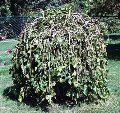 ‘Pendula’ (sometimes called weeping mulberry) is a dwarf, weeping cultivar that typically grows to only 6-10’ tall. It is typically top-grafted to a species tree, with its somewhat gnarled branches weeping to the ground. The male version of this weeping tree is M. alba ‘Chaparral’.