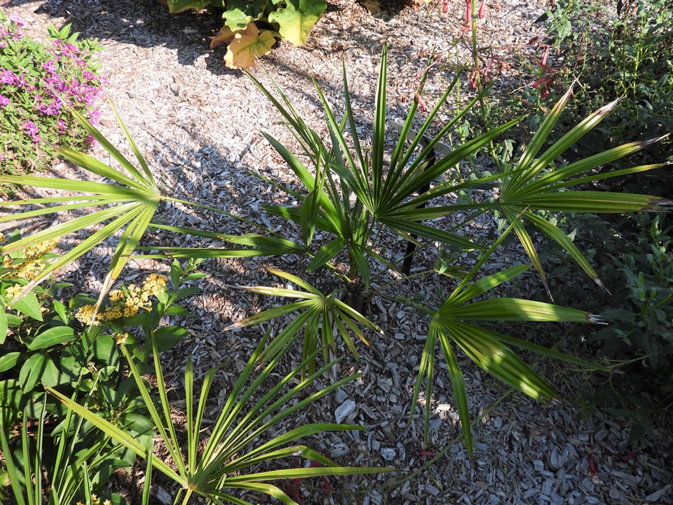 Trachycarpus wagnerianus, commonly called windmill palm, waggie (waggy) palm, or miniature Chusan palm, is a slow-growing, small to medium sized palm known only in cultivation and is believed to have originated in Japan. Mature plants have straight, unbranched trunks reaching 20′ tall topped with a 5′ wide crown of evergreen foliage. The trunks are covered in a layer of brown, woolly, fibrous remnants of the leaf bases. The palmate leaves can reach 5′ wide and are held on stiff, stout petioles, giving the crown a rounded shape. Dense, pendulous panicles of small, yellow flowers bloom from late spring to early summer and are followed by small, round, dark blue to black fruits. Synonymous with T. fortunei var. wagnerianus and T. fortunei ‘Wagnerianus’.