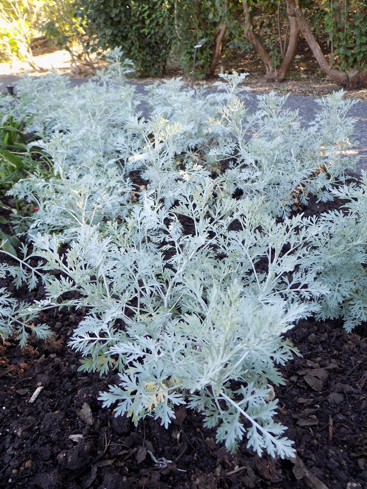 ‘Powis Castle’ is most likely a hybrid between Artemisia arborescens (large wormwood) and Artemisia absinthium (absinthe wormwood). It is a bushy, woody-based perennial or subshrub that is primarily grown for its aromatic, finely-divided, silvery, fern-like foliage which is feathery in appearance. It typically grows in a shrubby mound to 2-3’ tall and as wide, but spreads by rhizomes and may reach 3-6’ wide if not restrained. Tiny yellow-tinged silver flowers rarely bloom. Plants are essentially evergreen in warm winter climates.